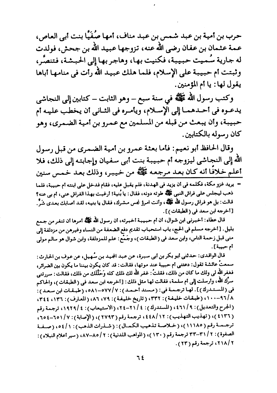 سمعت عائشة تقول: دعتني أم حبيبة عند موتها، فقالت: قد كان يكون بيننا ما يكون بين الضرائر، فغفر اللَّه لي ولك ما كان من ذلك، فقلت: غفر اللَّه لك ذلك كله وحلّلك من ذلك، فقالت: سررتني سرّك اللَّه، وأرسلت إلى أم سلمة، فقالت لها مثل ذلك: [أخرجه ابن سعد في (الطبقات) ، والحاكم في (المستدرك) ] . لها ترجمة في: (مسند أحمد) : 7/ 577- 581، (طبقات ابن سعد) :
