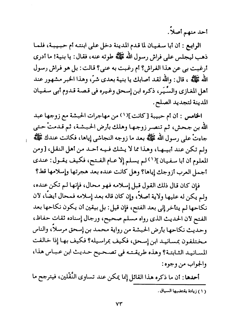 الخامس: أن أم حبيبة [كانت] [ (1) ] من مهاجرات الحبشة مع زوجها عبد اللَّه بن جحش، ثم تنصر زوجها وهلك بأرض الحبشة، ثم قدمت حتى جاءت على رسول اللَّه صلّى اللَّه عليه وسلم بعد ما زوجه النجاشي إياها، فكانت عندك صلّى اللَّه عليه وسلم ولم تكن عند أبيها، وهذا مما لا يشك فيه أحد من أهل النقل، [ومن المعلوم أن أبا سفيان] [ (1) ] لم يسلم إلا عام الفتح، فكيف يقول: عندي أجمل العرب أزواجك إياها؟ وهل كانت عنده بعد هجرتها وإسلامها قط؟