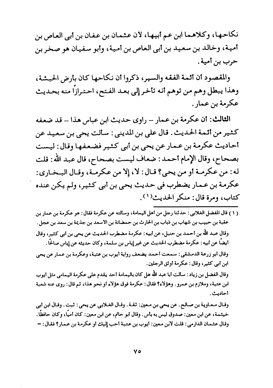 الثالث: أن عكرمة بن عمار- راوي حديث ابن عباس هذا- قد ضعفه كثير من أئمة الحديث. قال على بن المديني: سألت يحى بن سعيد عن أحاديث عكرمة بن عمار عن يحى بن أبى كثير فضعفها وقال: ليست بصحاح، وقال الإمام أحمد: ضعاف ليست بصحاح، قال عبد اللَّه: قلت له: من عكرمة أو من يحى؟ قال: لا، إلا من عكرمة، وقال البخاري: