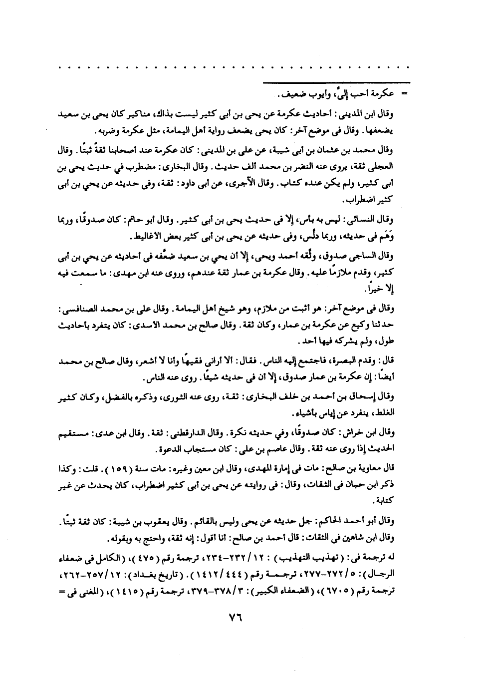 وقال ابن المدائني: أحاديث عكرمة عن يحى بن أبى كثير ليست بذاك، مناكير كان يحى بن سعيد يضعفها. وقال في موضع آخر: كان يحى يضعف رواية أهل اليمامة، مثل عكرمة وضربه.