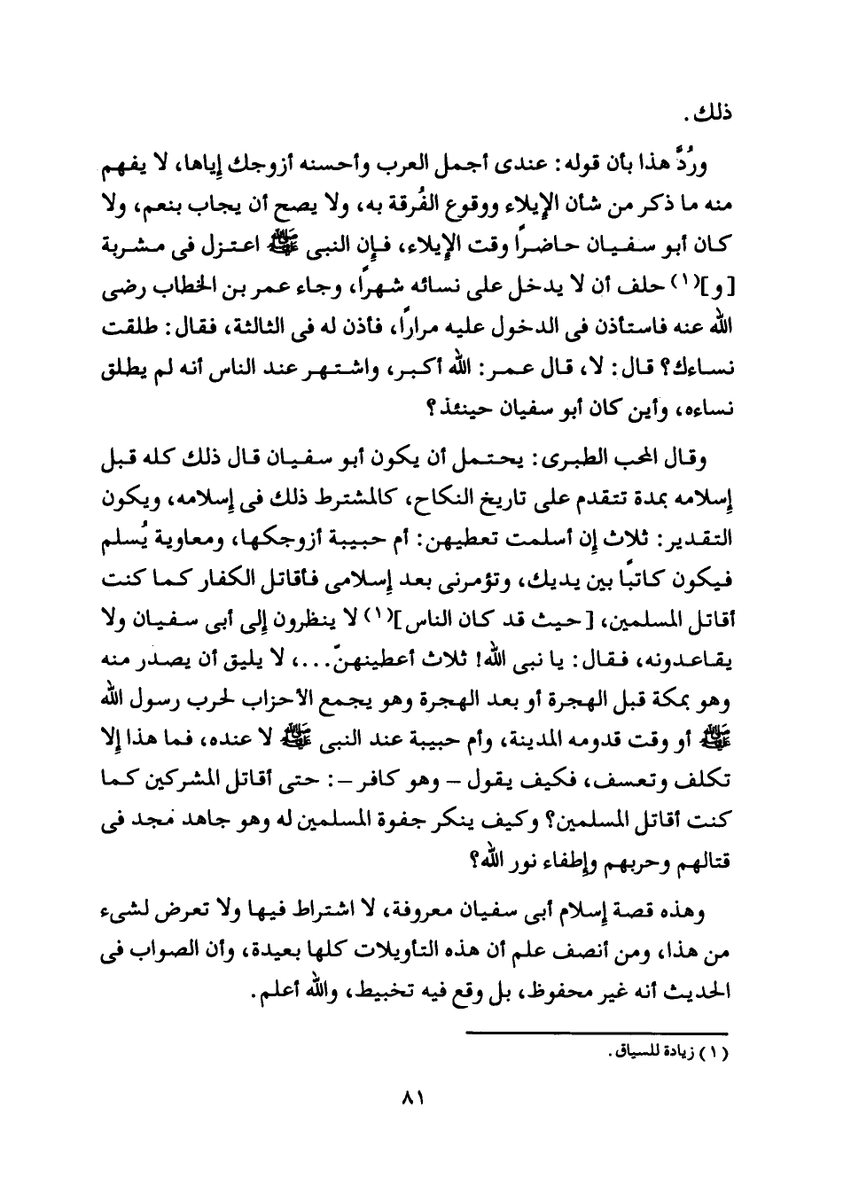 وهذه قصة إسلام أبى سفيان معروفة، لا اشتراط فيها ولا تعرض لشيء من هذا، ومن أنصف علم أن هذه التأويلات كلها بعيدة، وأن الصواب في الحديث أنه غير محفوظ، بل وقع فيه تخبيط، واللَّه أعلم.
