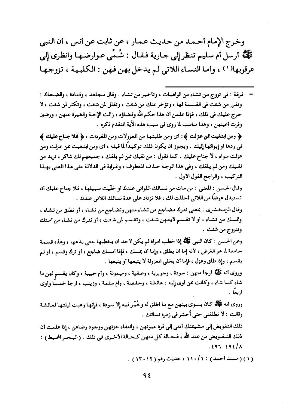 وروى أنه صلّى اللَّه عليه وسلم أرجأ منهن: سودة، وجويرية، وصفية، وميمونة، وأم حبيبة، وكان يقسم لهن ما شاء كما شاء، وكانت ممن أوى إليه: عائشة، وحفصة، وأم سلمة، وزينب، أرجأ خمسا وأوى أربعا.