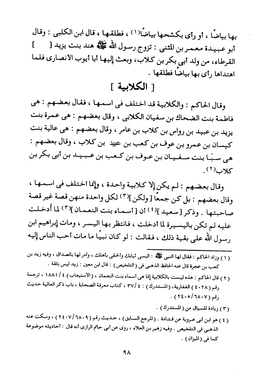 [ (2) ] قال الحاكم: هذه ليست بالكلابية إنما هي أسماء بنت النعمان، (الاستيعاب) 4/ 1881، ترجمة رقم (4028) الغفارية، (المستدرك) : 4/ 37، كتاب معرفة الصحابة، باب ذكر العالية حديث رقم (6807/ 2405) .