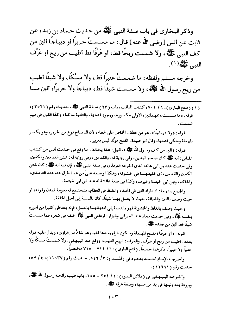 [ (1) ] (فتح الباري) : 6/ 702، كتاب المناقب، باب (23) صفة النبي صلى اللَّه عليه وسلم، حديث رقم (3561) ، قوله: «ما مسست» بمهملتين، الأولى مكسورة، ويجوز فتحها، والثانية ساكنة، وكذا القول في ميم شممت.