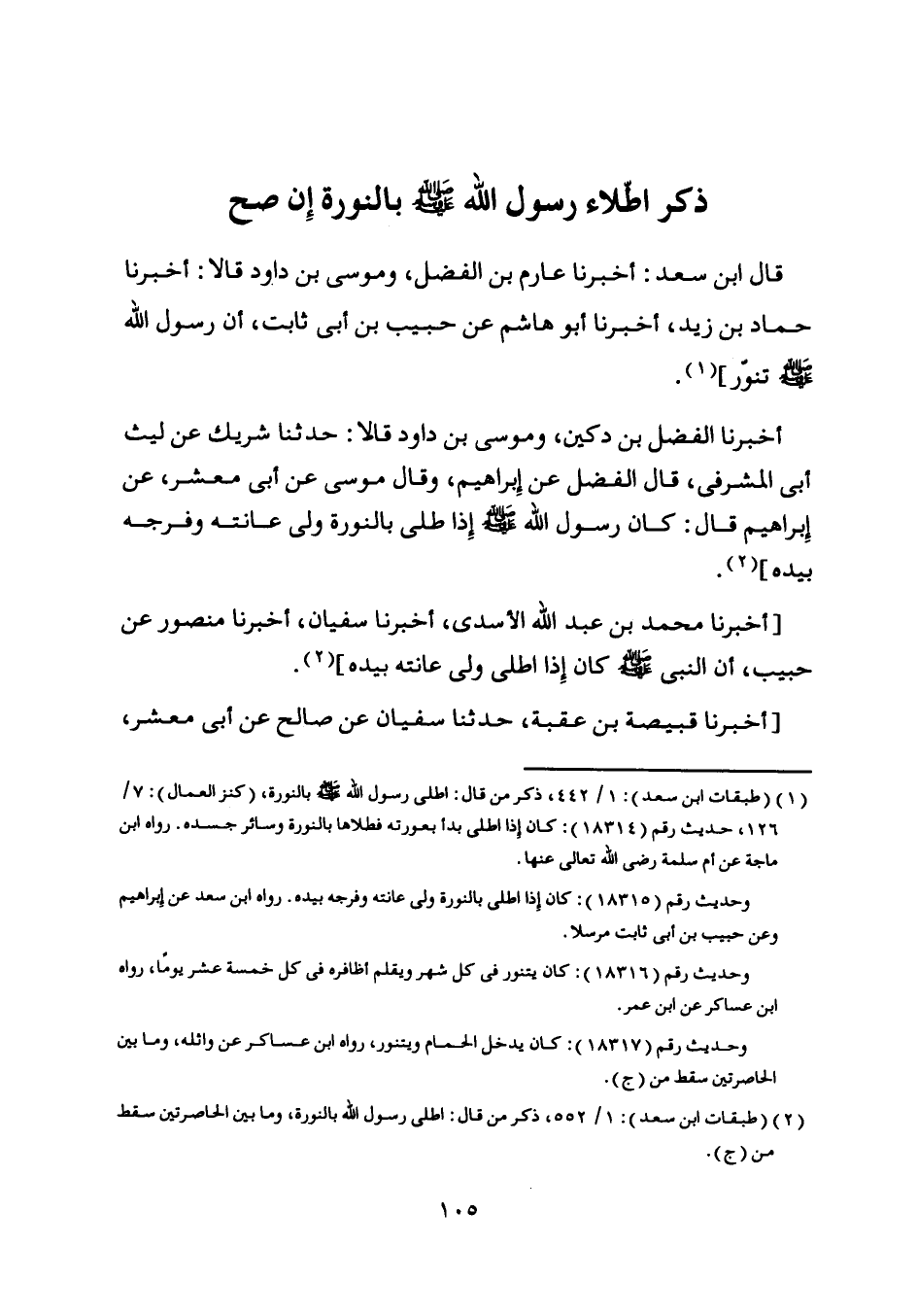 [ (2) ] (طبقات ابن سعد) : 1/ 552، ذكر من قال: اطّلى رسول اللَّه بالنورة، وما بين الحاصرتين سقط من (ج) .