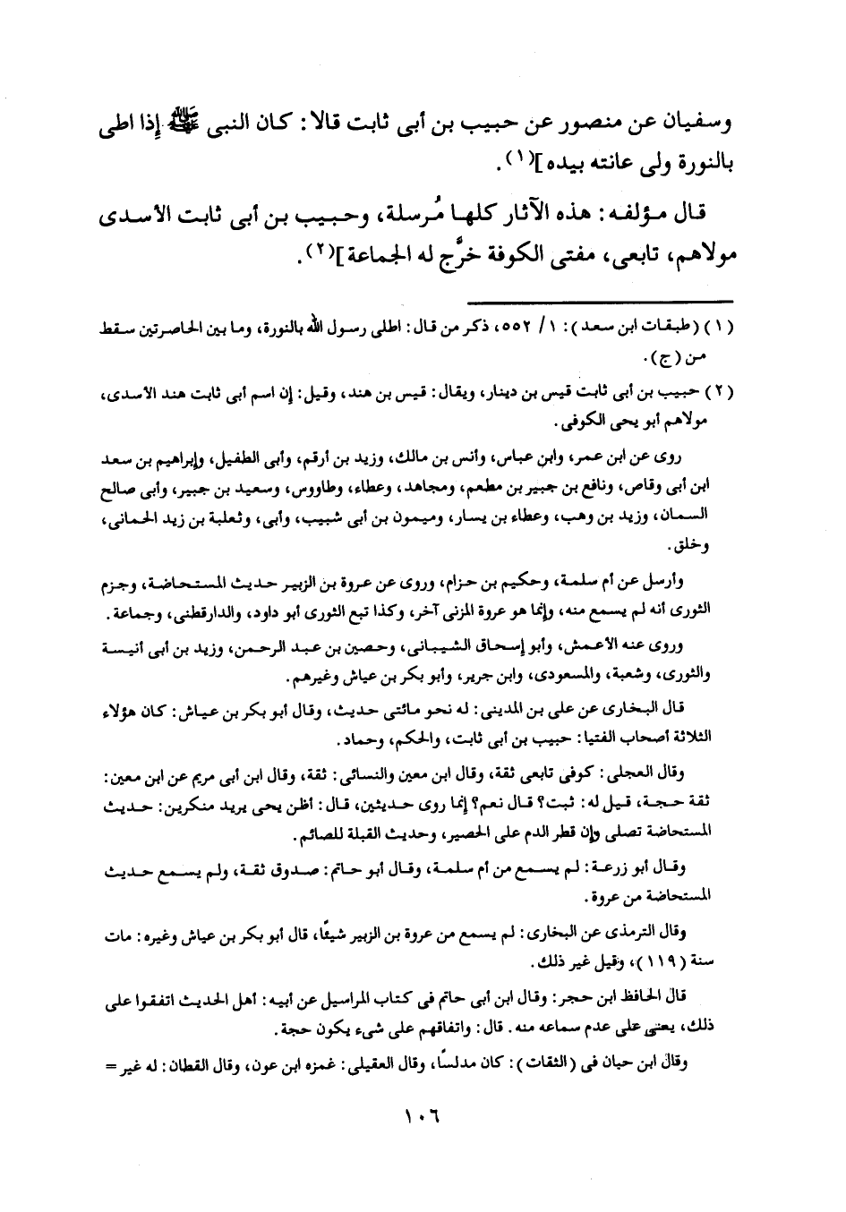قال مؤلفه: هذه الآثار كلها مرسلة، وحبيب بن أبى ثابت الأسدي مولاهم، تابعي، مفتى الكوفة خرّج له الجماعة] [ (2) ] .