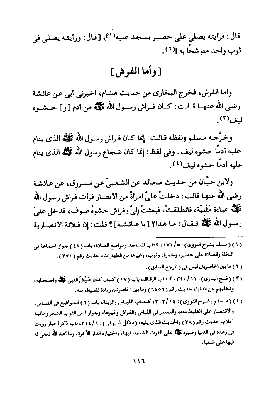 وأما الفرش، فخرج البخاري من حديث هشام، أخبرنى أبى عن عائشة رضى اللَّه عنها قالت: كان فراش رسول اللَّه صلى اللَّه عليه وسلم من أدم [و] حشوه ليف [ (3) ] .