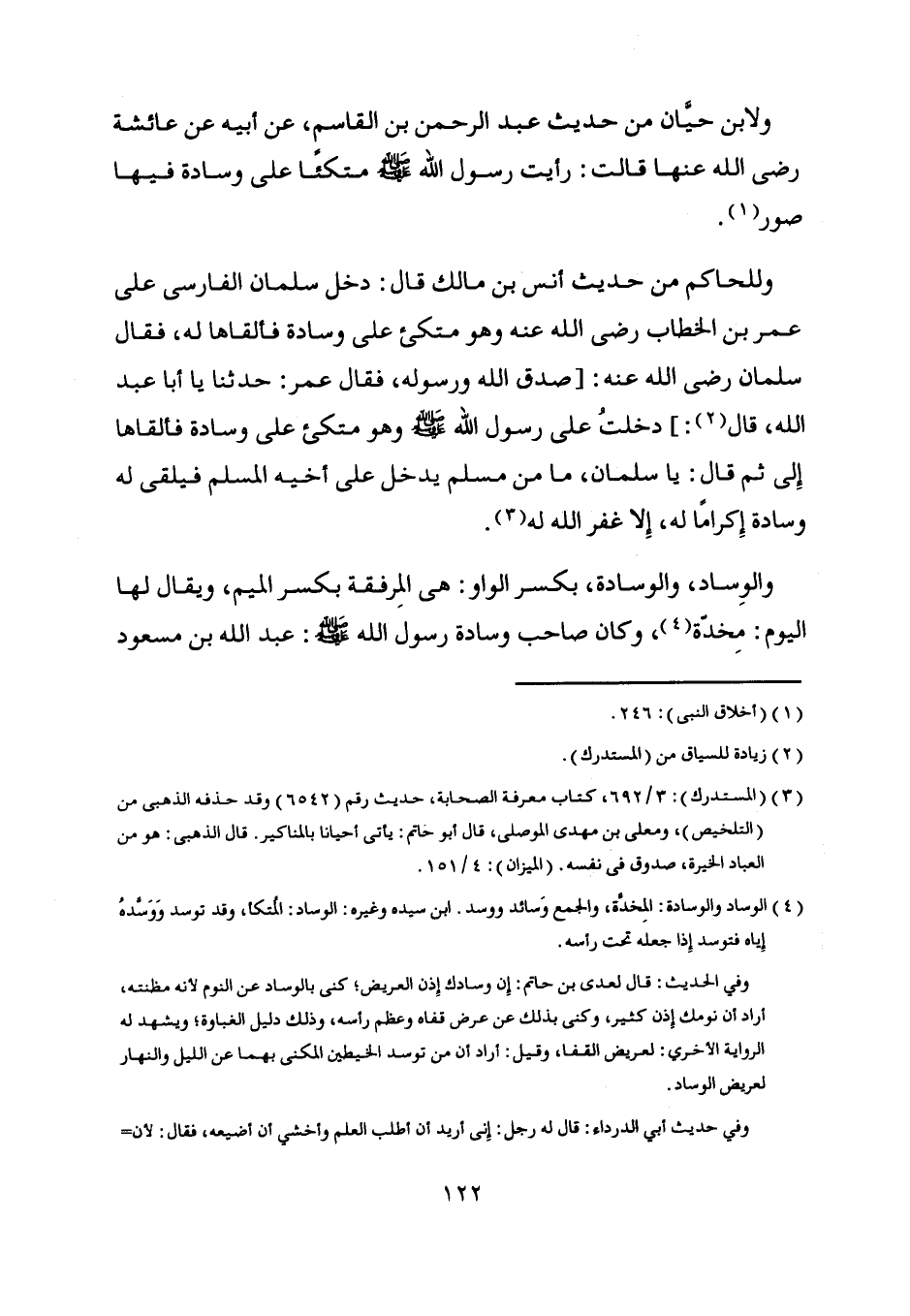 والوساد، والوسادة، بكسر الواو: هي المرفقة بكسر الميم، ويقال لها اليوم: مخدّة [ (4) ] ، وكان صاحب وسادة رسول اللَّه صلى اللَّه عليه وسلم: عبد اللَّه بن مسعود