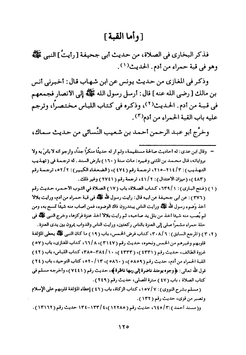[ (2، 3) ] (المرجع السابق) : 6/ 308، كتاب فرض الخمس، باب (19) ما كان النبي صلى اللَّه عليه وسلم يعطى المؤلفة قلوبهم وغيرهم من الخمس ونحوه، حديث رقم (3147) ، 8/ 66، كتاب المغازي، باب (57) غزوة الطائف، حديث رقم (4331) ، (4333) ، 10/ 384- 385، كتاب اللباس، باب (42) القبة الحمراء من أدم، حديث رقم (5859) ، (5860) ، 13/ 520، كتاب التوحيد، باب (24) قول اللَّه تعالى: وُجُوهٌ يَوْمَئِذٍ ناضِرَةٌ إِلى رَبِّها ناظِرَةٌ، حديث رقم (7441) ، وأخرجه مسلم في كتاب الصلاة، باب (47) سترة المصلى، حديث رقم (249) .