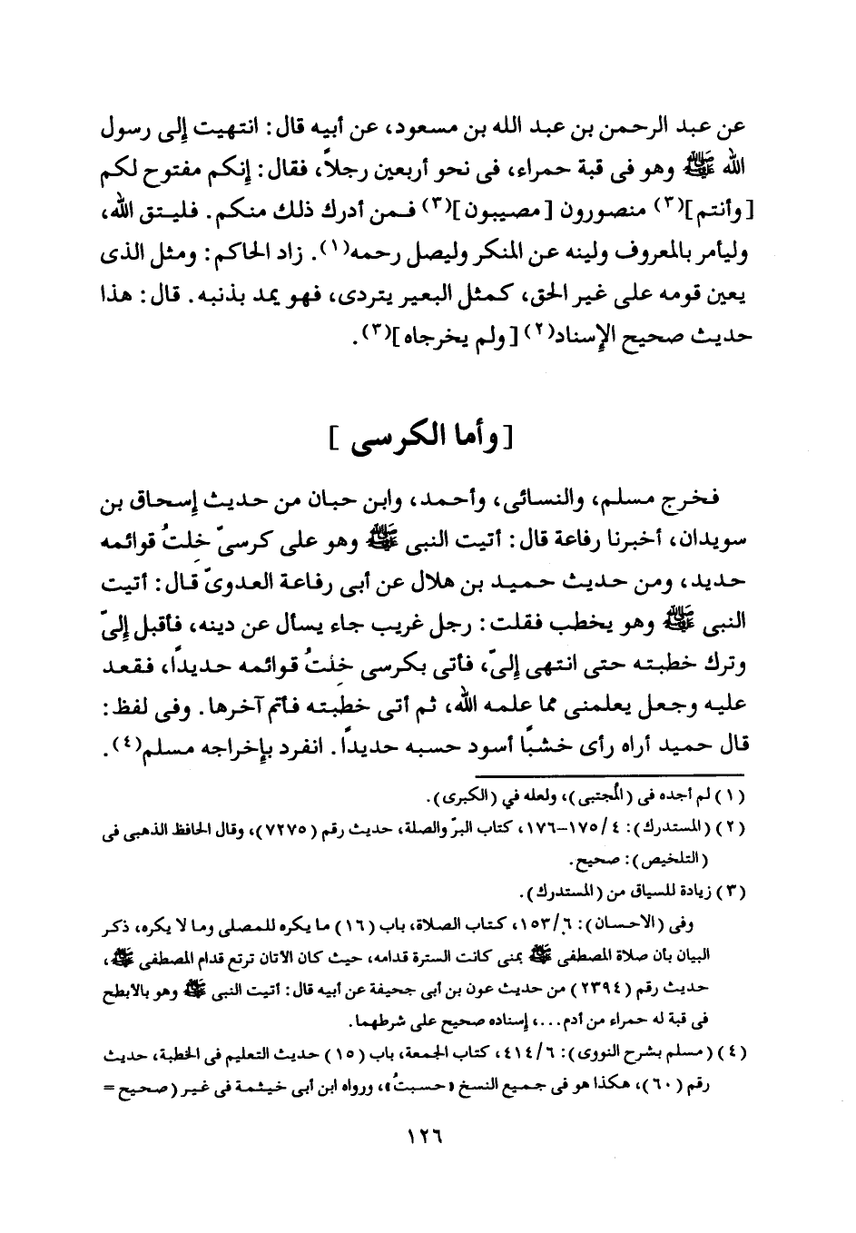 عن عبد الرحمن بن عبد اللَّه بن مسعود، عن أبيه قال: انتهيت إلى رسول اللَّه صلى اللَّه عليه وسلم وهو في قبة حمراء، في نحو أربعين رجلا، فقال: إنكم مفتوح لكم [وأنتم] [ (1) ] منصورون [مصيبون] [ (1) ] فمن أدرك ذلك منكم. فليتق اللَّه، وليأمر بالمعروف ولينه عن المنكر وليصل رحمه [ (2) ] . زاد الحاكم: ومثل الّذي يعين قومه على غير الحق، كمثل البعير يتردى، فهو يمد بذنبه.