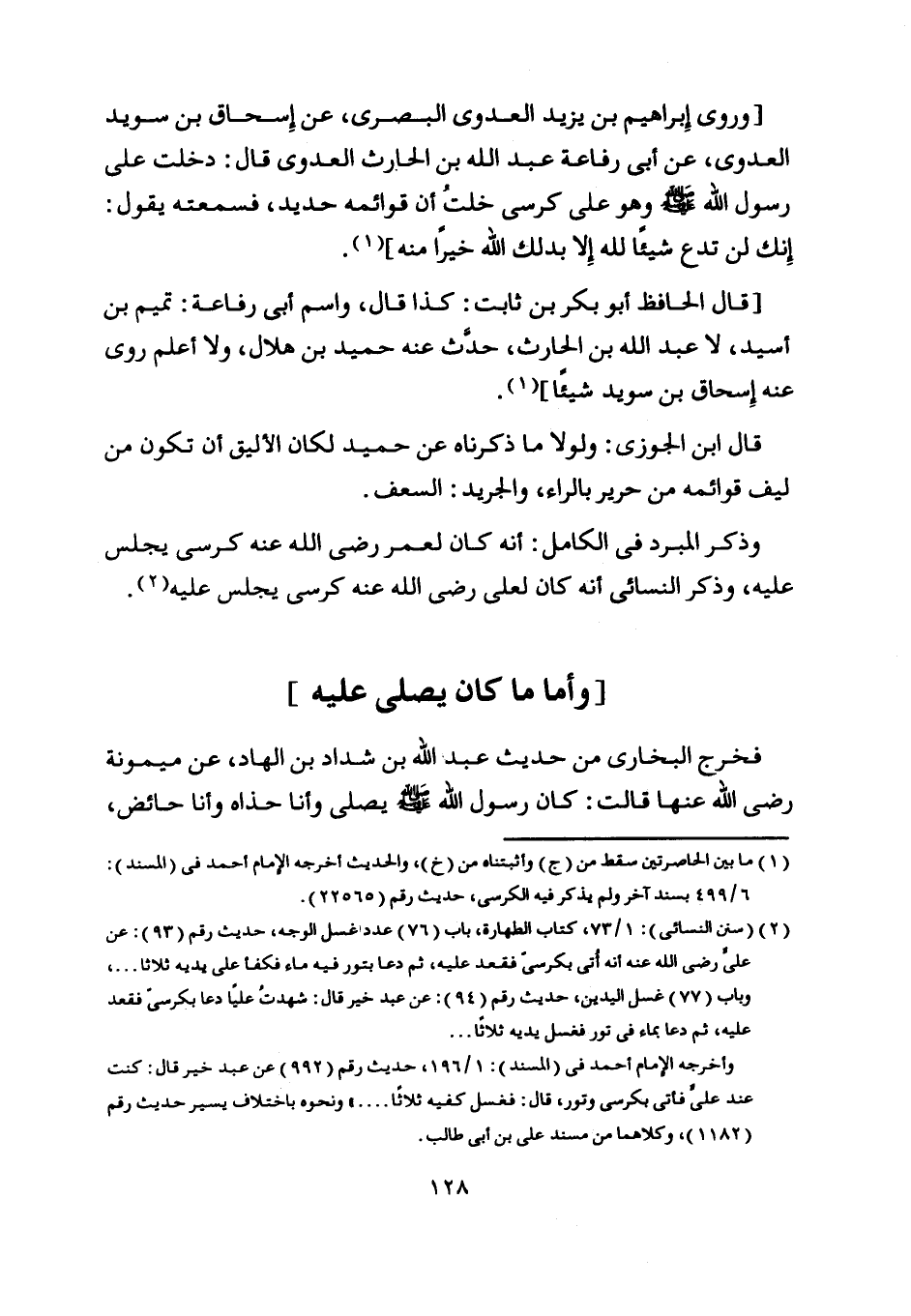 وذكر المبرد في الكامل: أنه كان لعمر رضى اللَّه عنه كرسي يجلس عليه، وذكر النسائي أنه كان لعلى رضى اللَّه عنه كرسي يجلس عليه [ (2) ] .
