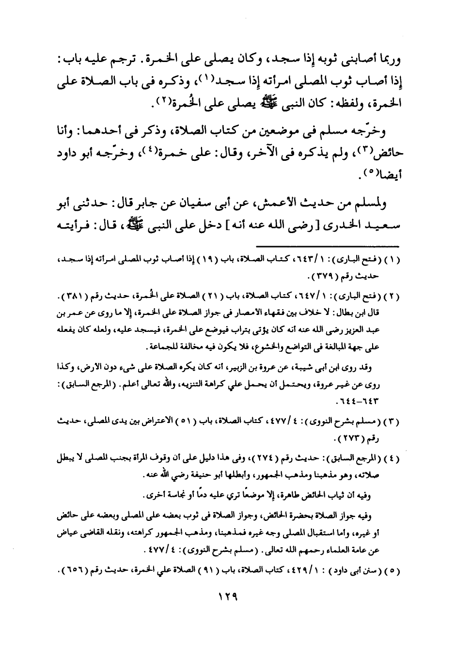 [ (2) ] (فتح الباري) : 1/ 647، كتاب الصلاة، باب (21) الصلاة على الخمرة، حديث رقم (381) .