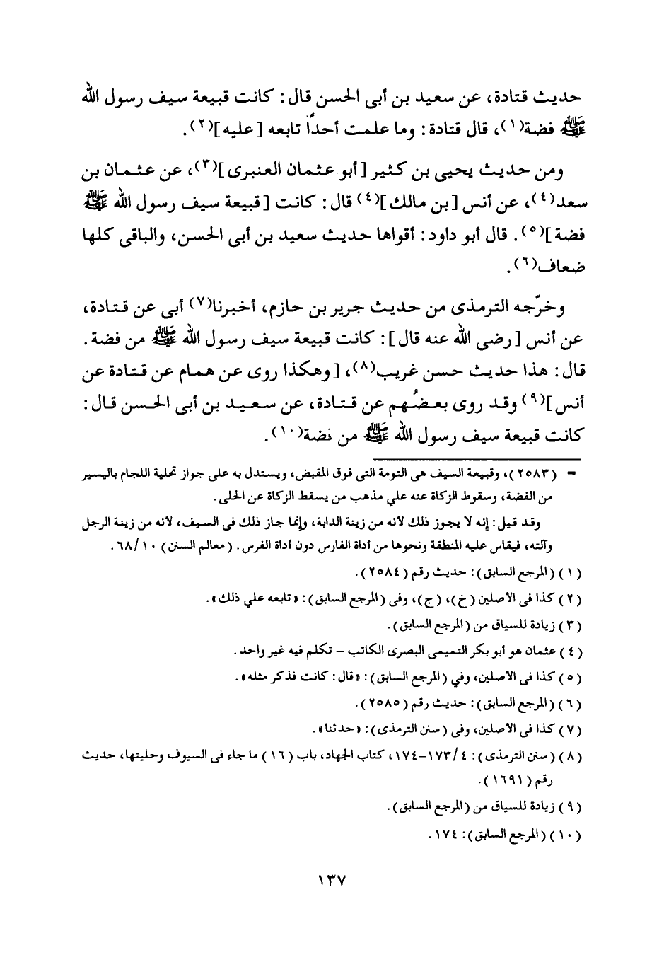 ومن حديث يحيى بن كثير [أبو عثمان العنبري] [ (3) ] ، عن عثمان بن سعد [ (4) ] ، عن أنس [بن مالك] [ (4) ] قال: كانت [قبيعة سيف رسول اللَّه صلى اللَّه عليه وسلم فضة] [ (5) ] . قال أبو داود: أقواها حديث سعيد بن أبى الحسن، والباقي كلها ضعاف [ (6) ] .