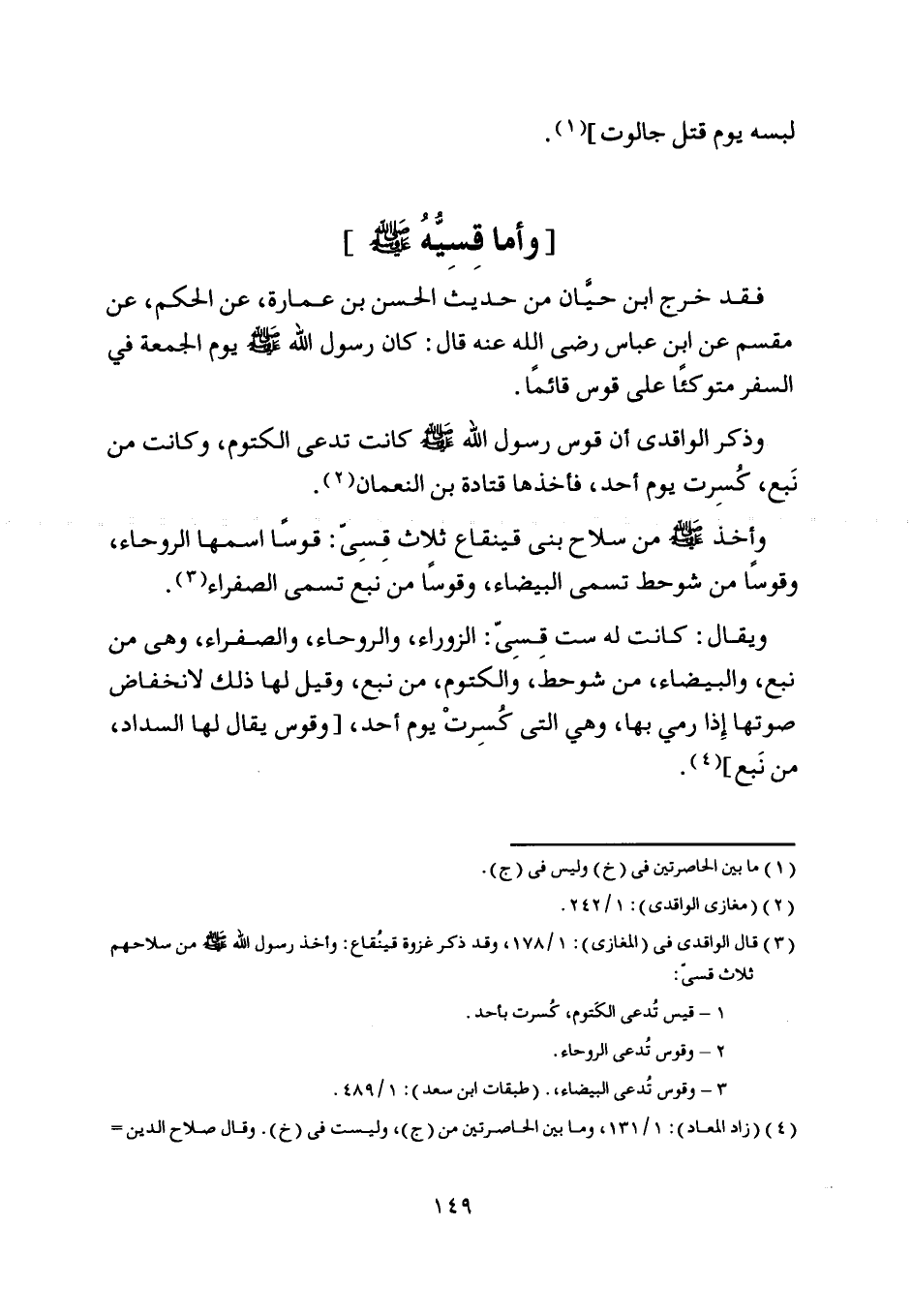 [ (3) ] قال الواقدي في (المغازي) : 1/ 178، وقد ذكر غزوة قينقاع: وأخذ رسول اللَّه صلى اللَّه عليه وسلم من سلاحهم ثلاث قسىّ: