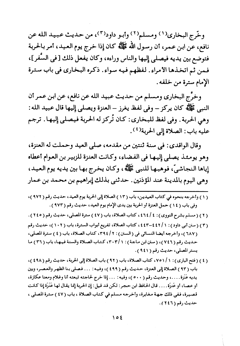 وخرّج البخاري [ (1) ] ومسلم [ (2) ] وأبو داود [ (3) ] ، من حديث عبيد اللَّه عن نافع، عن ابن عمر، أن رسول اللَّه صلى اللَّه عليه وسلم كان إذا خرج يوم العيد، أمر بالحربة فتوضع بين يديه فيصلي إليها والناس وراءه، وكان يفعل ذلك [في السّفر] ، فمن ثم اتخذها الأمراء. لفظهم فيه سواء. ذكره البخاري في باب سترة الإمام سترة من خلفه.
