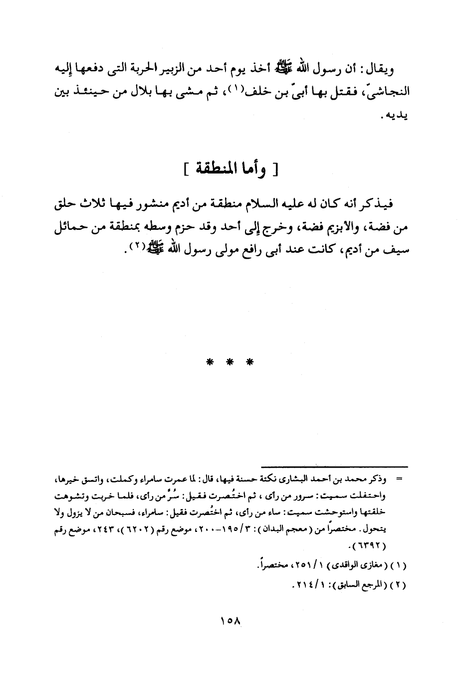 فيذكر أنه كان له عليه السلام منطقة من أديم منشور فيها ثلاث حلق من فضة، والإبزيم فضة، وخرج إلى أحد وقد حزم وسطه بمنطقة من حمائل سيف من أديم، كانت عند أبى رافع مولى رسول اللَّه صلى اللَّه عليه وسلم [ (2) ] .