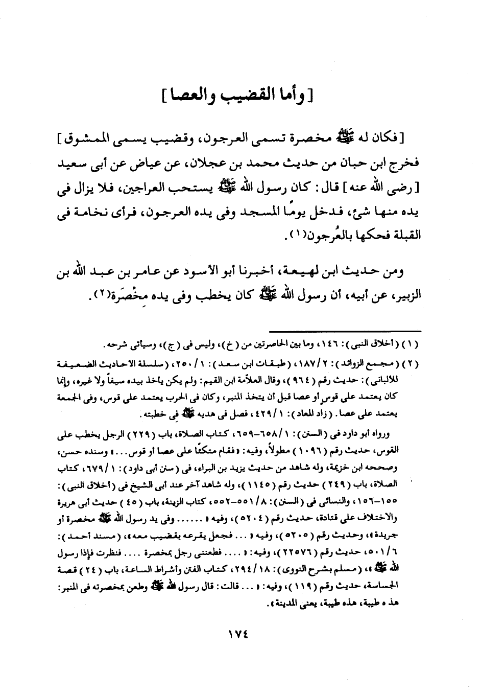 [ (2) ] (مجمع الزوائد) : 2/ 187، (طبقات ابن سعد) : 1/ 250، (سلسلة الأحاديث الضعيفة للألبانى) : حديث رقم (964) ، وقال العلّامة ابن القيم: ولم يكن يأخذ بيده سيفا ولا غيره، وإنما كان يعتمد على قوس أو عصا قبل أن يتخذ المنبر، وكان في الحرب يعتمد على قوس، وفي الجمعة يعتمد على عصا. (زاد المعاد) : 1/ 429، فصل في هديه صلى اللَّه عليه وسلم في خطبته.
