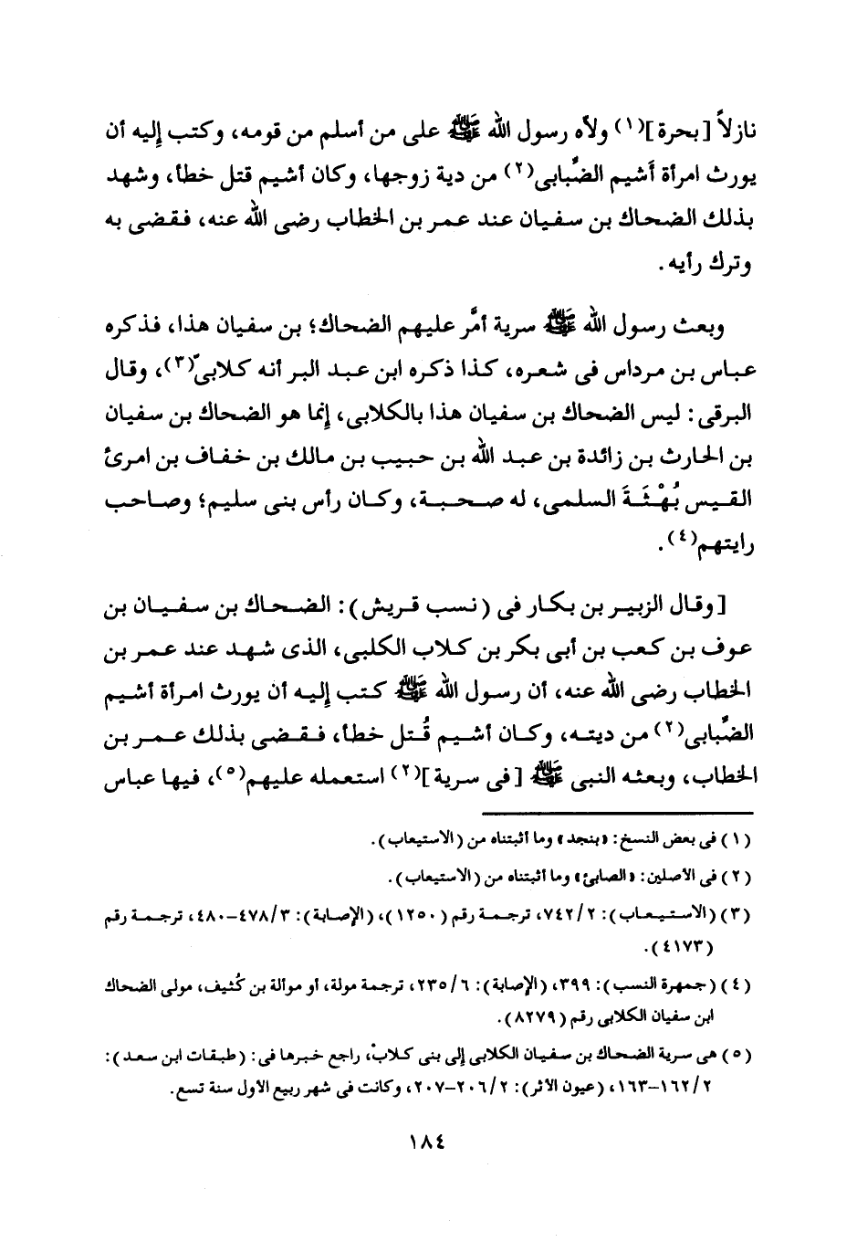 [وقال الزبير بن بكار في (نسب قريش) : الضحاك بن سفيان بن عوف بن كعب بن أبى بكر بن كلاب الكلبي، الّذي شهد عند عمر بن الخطاب رضى اللَّه عنه، أن رسول اللَّه صلى اللَّه عليه وسلم كتب إليه أن يورث امرأة أشيم الضّبابى [ (2) ] من ديته، وكان أشيم قتل خطأ، فقضى بذلك عمر بن الخطاب، وبعثه النبي صلى اللَّه عليه وسلم [في سرية] [ (2) ] استعمله عليهم [ (5) ] ، فيها عباس