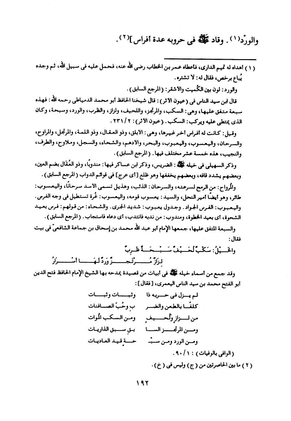 والورد [ (1) ] . وقاد صلى اللَّه عليه وسلم في حروبه عدة أفراس] [ (2) ] .