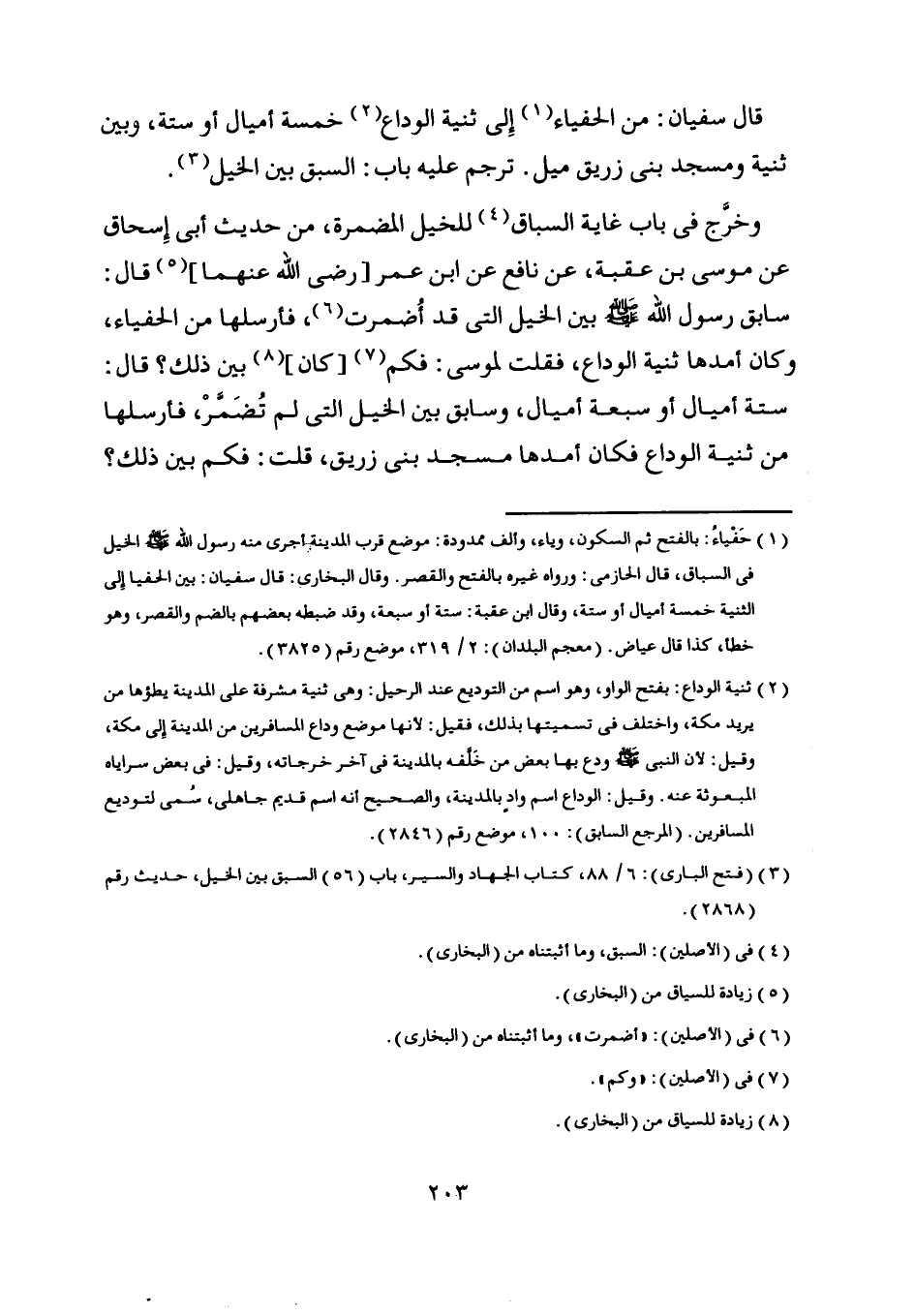 قال سفيان: من الحفياء [ (1) ] إلى ثنية الوداع [ (2) ] خمسة أميال أو ستة، وبين ثنية ومسجد بنى زريق ميل. ترجم عليه باب: السبق بين الخيل [ (3) ] .