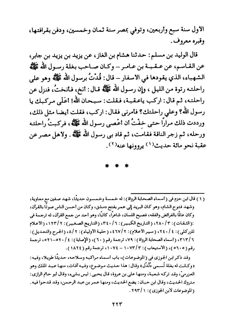 قال الوليد بن مسلم: حدثنا هشام بن الغاز، عن يزيد بن يزيد بن جابر، عن القاسم، عن عقبة بن عامر- وكان صاحب بغلة رسول اللَّه صلى اللَّه عليه وسلم الشهباء، الّذي يقودها في الأسفار- قال: قدت برسول اللَّه صلى اللَّه عليه وسلم وهو على راحلته رتوة من الليل، وإن رسول اللَّه صلى اللَّه عليه وسلم قال: أنخ، فأنخت، فنزل عن راحلته، ثم قال: اركب يا عقبة، فقلت: سبحان اللَّه! أعلى مركبك يا رسول اللَّه؟ وعلى راحلتك؟ فأمرنى فقال: اركب، فقلت أيضا مثل ذلك، ورددت ذلك مرارا حتى خفت أن أعصى رسول اللَّه صلى اللَّه عليه وسلم، فركبت راحلته ورحله، ثم زجر الناقة فقامت، ثم قاد بى رسول اللَّه صلى اللَّه عليه وسلم.