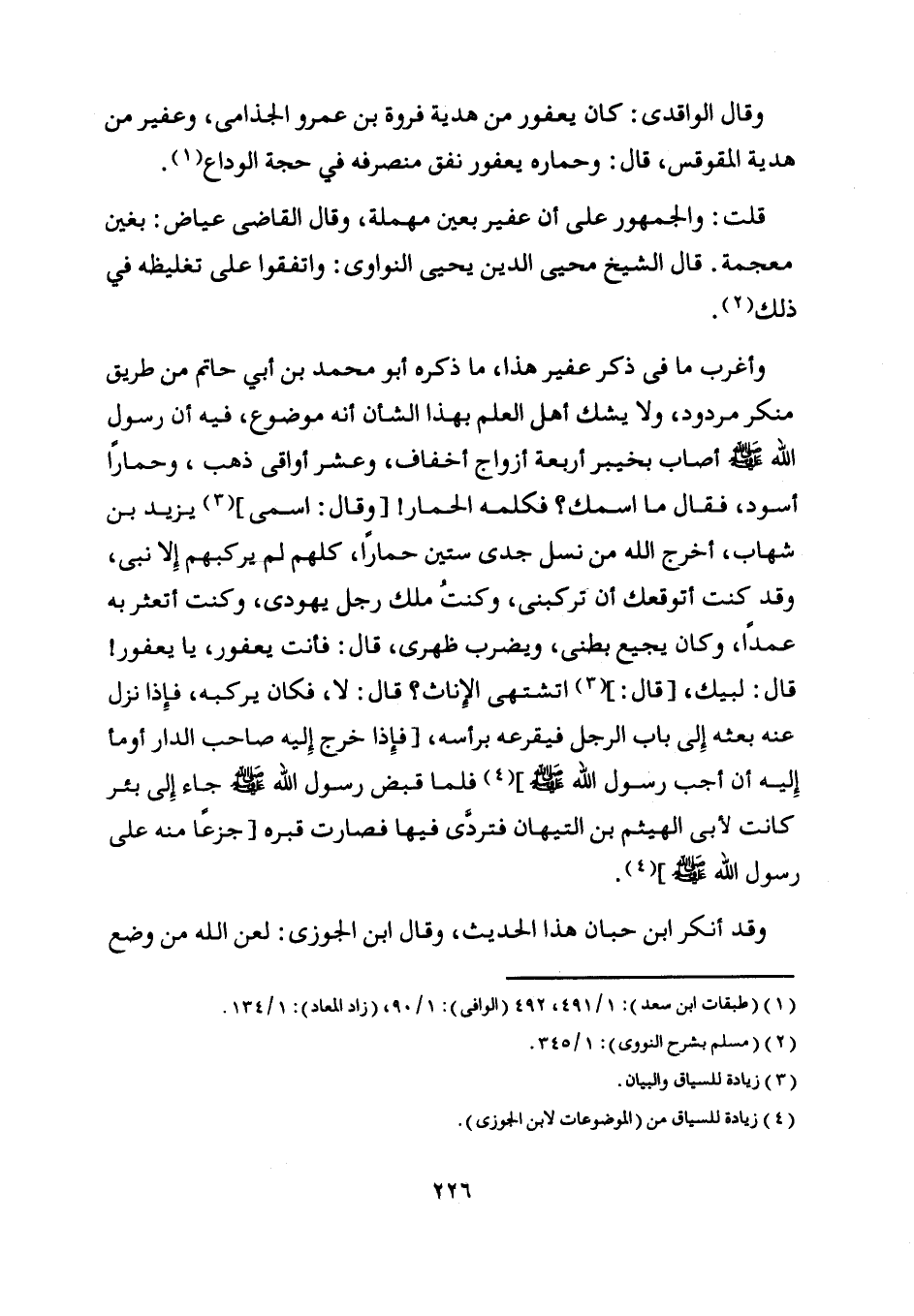 ذكره أبو محمد بن أبى حاتم من طريق منكر مردود، ولا يشك أهل العلم بهذا الشأن أنه موضوع، فيه أن رسول اللَّه صلى اللَّه عليه وسلم أصاب بخيبر أربعة أزواج أخفاف، وعشر أواقي ذهب، وحمارا أسود، فقال ما اسمك؟ فكلمه الحمار! [وقال: اسمى] [ (3) ] يزيد بن شهاب، أخرج اللَّه من نسل جدي ستين حمارا، كلهم لم يركبهم إلا نبي، وقد كنت أتوقعك أن تركبني، وكنت ملك رجل يهودي، وكنت أتعثر به عمدا، وكان يجيع بطني، ويضرب ظهري، قال: فأنت يعفور، يا يعفور! قال: لبيك، [قال:] [ (3) ] أتشتهى الإناث؟ قال: لا، فكان يركبه،