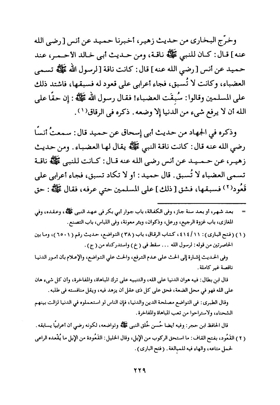 وخرّج البخاري من حديث زهير، أخبرنا حميد عن أنس [رضى اللَّه عنه] قال: كان للنّبيّ صلى اللَّه عليه وسلم ناقة،