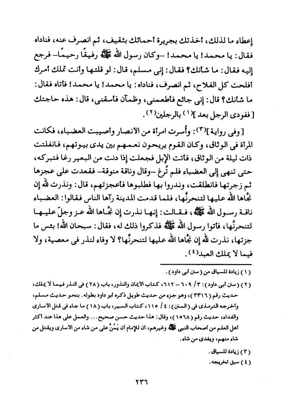 [وفي رواية] [ (3) ] : وأسرت امرأة من الأنصار وأصيبت العضباء، فكانت المرأة في الوثاق، وكان القوم يريحون نعمهم بين يدي بيوتهم، فانفلتت ذات ليلة من الوثاق، فأتت الإبل فجعلت إذا دنت من البعير رغا فتبركه، حتى تنهى إلى العضباء فلم ترغ- وقال وناقة منوقة- فقعدت على عجزها ثم زجرتها فانطلقت، وندروا بها فطلبوها فأعجزتهم، قال: ونذرت للَّه إن نجّاها اللَّه عليها لتنحرنّها، فلما قدمت المدينة رآها الناس فقالوا: العضباء ناقة رسول اللَّه صلى اللَّه عليه وسلم، فقالت: إنها نذرت إن نجّاها اللَّه عز وجلّ عليها لتنحرنّها، فأتوا رسول اللَّه صلى اللَّه عليه وسلم فذكروا ذلك له، فقال: سبحان اللَّه! بئس ما جزتها، نذرت للَّه إن نجّاها اللَّه عليها لتنحرنّها؟ لا وفاء لنذر في معصية، ولا فيما لا يملك العبد [ (4) ] .