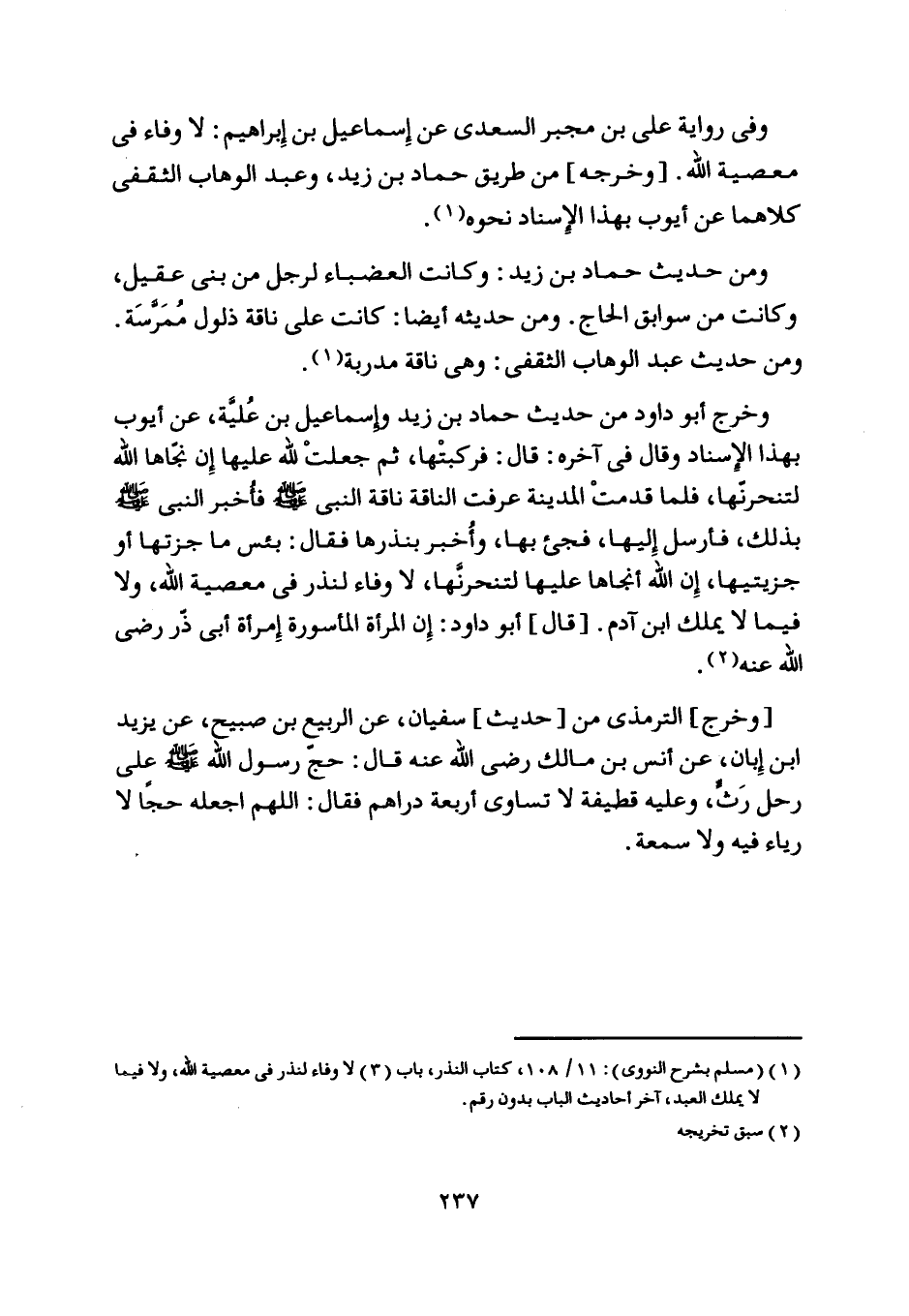 [ (1) ] (مسلم بشرح النووي) : 11/ 108، كتاب النذر، باب (3) لا وفاء لنذر في معصية اللَّه، ولا فيما لا يملك العبد، آخر أحاديث الباب بدون رقم.