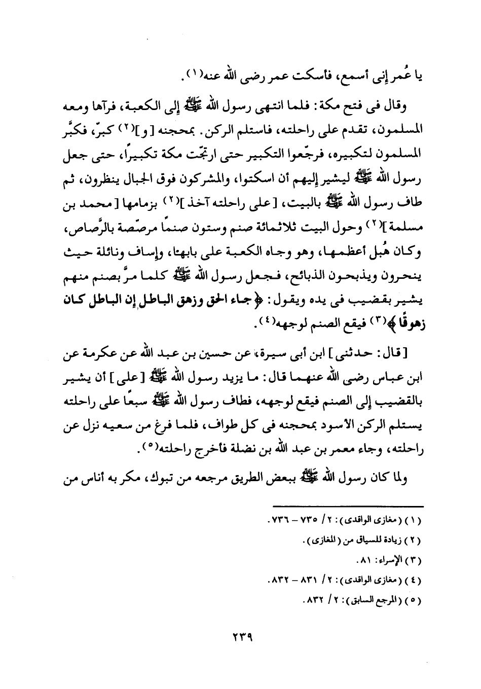 [قال: حدثني] ابن أبى سيرة، عن حسين بن عبد اللَّه عن عكرمة عن ابن عباس رضى اللَّه عنهما قال: ما يزيد رسول اللَّه صلى اللَّه عليه وسلم [على] أن يشير بالقضيب إلى الصنم فيقع لوجهه، فطاف رسول اللَّه صلى اللَّه عليه وسلم سبعا على راحلته يستلم الركن الأسود بمحجنه في كل طواف، فلما فرغ من سعيه نزل عن راحلته، وجاء معمر بن عبد اللَّه بن نضلة فأخرج راحلته [ (5) ] .