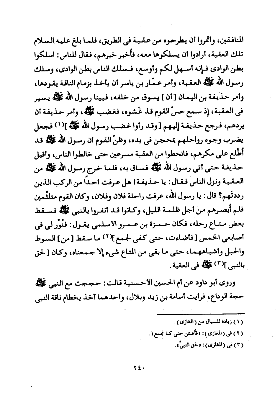 فلما خرج رسول اللَّه صلى اللَّه عليه وسلم من العقبة ونزل الناس فقال: يا حذيفة! هل عرفت أحدا من الركب الذين رددتهم؟ قال: يا رسول اللَّه، عرفت راحلة فلان وفلان، وكان القوم متلثّمين فلم أبصرهم من أجل ظلمة الليل،