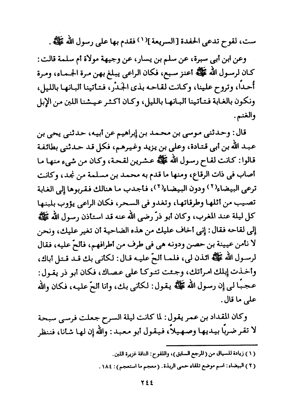قال: وحدثني موسى بن محمد بن إبراهيم عن أبيه، حدثني يحيى بن عبد اللَّه بن أبى قتادة، وعلى بن يزيد وغيرهم، فكل قد حدثني بطائفة قالوا: كانت لقاح رسول اللَّه صلى اللَّه عليه وسلم عشرين لقحة، وكان من شيء منها ما أصاب في ذات الرقاع، ومنها ما قدم به محمد بن مسلمة من نجد، وكانت ترعى البيضاء [ (2) ] ودون البيضاء [ (2) ] ، فأجدب ما هنالك فقربوها إلى الغابة تصيب من أثلها وطرقاتها، وتغدو في السحر، فكان الراعي يؤوب بلبنها كل ليلة عند المغرب،