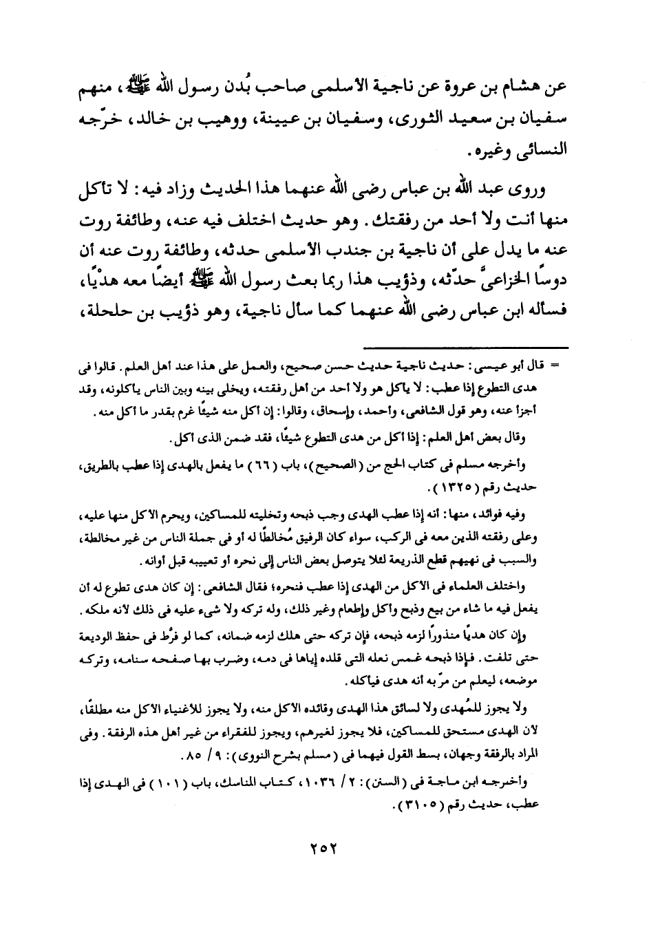 عن هشام بن عروة عن ناجية الأسلمي صاحب بدن رسول اللَّه صلى اللَّه عليه وسلم، منهم سفيان بن سعيد الثوري، وسفيان بن عيينة، ووهيب بن خالد، خرّجه النسائي وغيره.