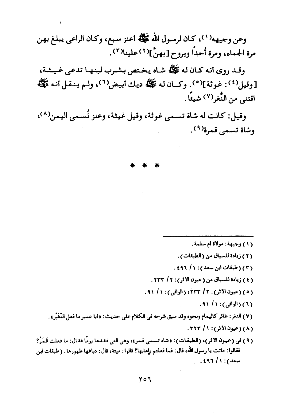 وقيل: كانت له شاة تسمى غوثة، وقيل غيثة، وعنز تسمى اليمن [ (8) ] ، وشاة تسمى قمرة [ (9) ] .