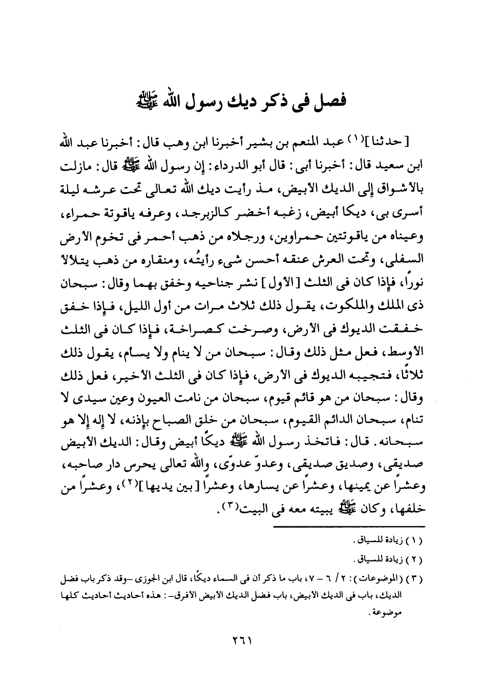 [ (3) ] (الموضوعات) : 2/ 6- 7، باب ما ذكر أن في السماء ديكا، قال ابن الجوزي- وقد ذكر باب فضل الديك، باب في الديك الأبيض، باب فضل الديك الأبيض الأفرق-: هذه أحاديث أحاديث كلها موضوعة.