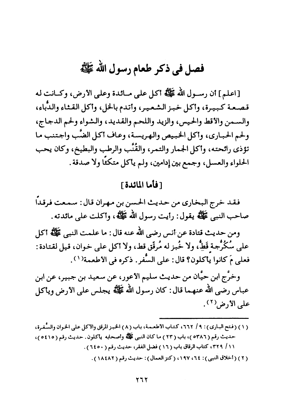 [اعلم] أن رسول اللَّه صلى اللَّه عليه وسلم أكل على مائدة وعلى الأرض، وكانت له قصعة كبيرة، وأكل خبز الشعير، وائتدم بالخل، وأكل القثاء والدّباء، والسمن والأقط والحيس، والزيد واللحم والقديد، والشواء ولحم الدجاج، ولحم الحبارى، وأكل الخبيص والهريسة، وعاف أكل الضّب واجتنب ما تؤذى رائحته، وأكل الجمار والتمر، والقنّب والرطب والبطيخ، وكان يحب الحلواء والعسل، وجمع بين إدامين، ولم يأكل متكئا ولا صدقة.