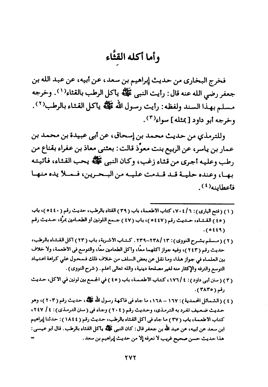 [ (4) ] (الشمائل المحمدية) : 167- 168، ما جاء في فاكهة رسول اللَّه صلى اللَّه عليه وسلم، حديث رقم (203) ، وهو حديث ضعيف تفرد به الترمذي، وحديث رقم (204) وجاء في (سنن الترمذي) : 4/ 247، كتاب الأطعمة، باب (37) ما جاء في أكل القثاء بالرطب، حديث رقم (1844) : حدثنا إبراهيم ابن سعد عن أبيه، عن عبد اللَّه بن جعفر قال: كان النبي صلى اللَّه عليه وسلم يأكل القثاء بالرطب. قال أبو عيسى: