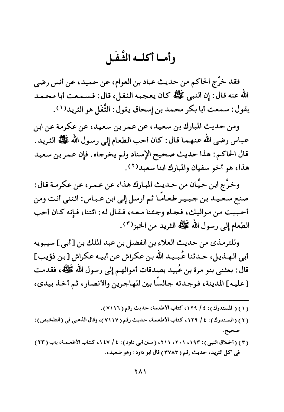 [ (3) ] (أخلاق النبي) : 193، 201، 211، (سنن أبى داود) : 4/ 147، كتاب الأطعمة، باب (23) في أكل الثريد، حديث رقم (3783) قال أبو داود: وهو ضعيف.