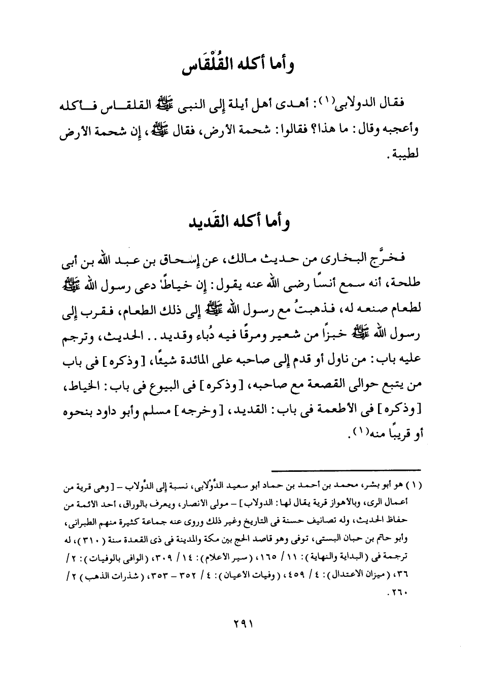 فقال الدولابي [ (1) ] : أهدى أهل أيلة إلى النبي صلى اللَّه عليه وسلم القلقاس فأكله وأعجبه وقال: ما هذا؟ فقالوا: شحمة الأرض، فقال صلى اللَّه عليه وسلم، إن شحمة الأرض لطيبة.
