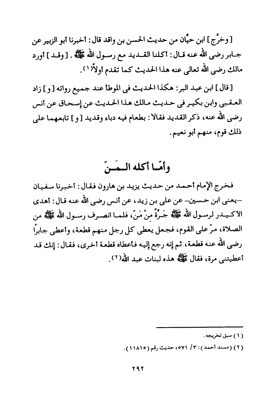فخرج الإمام أحمد من حديث يزيد بن هارون فقال: أخبرنا سفيان- يعنى ابن حسين- عن على بن زيد، عن أنس رضى اللَّه عنه قال: أهدى الأكيدر لرسول اللَّه صلى اللَّه عليه وسلم جرّة من منّ، فلما انصرف رسول اللَّه صلى اللَّه عليه وسلم من الصلاة، مرّ على القوم، فجعل يعطى كل رجل منهم قطعة، وأعطى جابرا رضى اللَّه عنه قطعة، ثم إنه رجع إليه فأعطاه قطعة أخرى، فقال: إنك قد أعطيتنى مرة، فقال صلى اللَّه عليه وسلم هذه لبنات عبد اللَّه [ (2) ] .