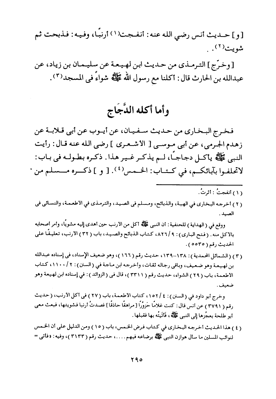 وخرج أبو داود في (السنن) : 4/ 152، كتاب الأطعمة، باب (27) في أكل الأرنب، (حديث رقم (3791) عن أنس قال: كنت غلاما حزوّرا [مراهقا حاذقا] فصدت أرنبا فشويتها، فبعث معى أبو طلحة بعجزها إلى النبي صلى اللَّه عليه وسلم، فأتيته بها فقبلها.