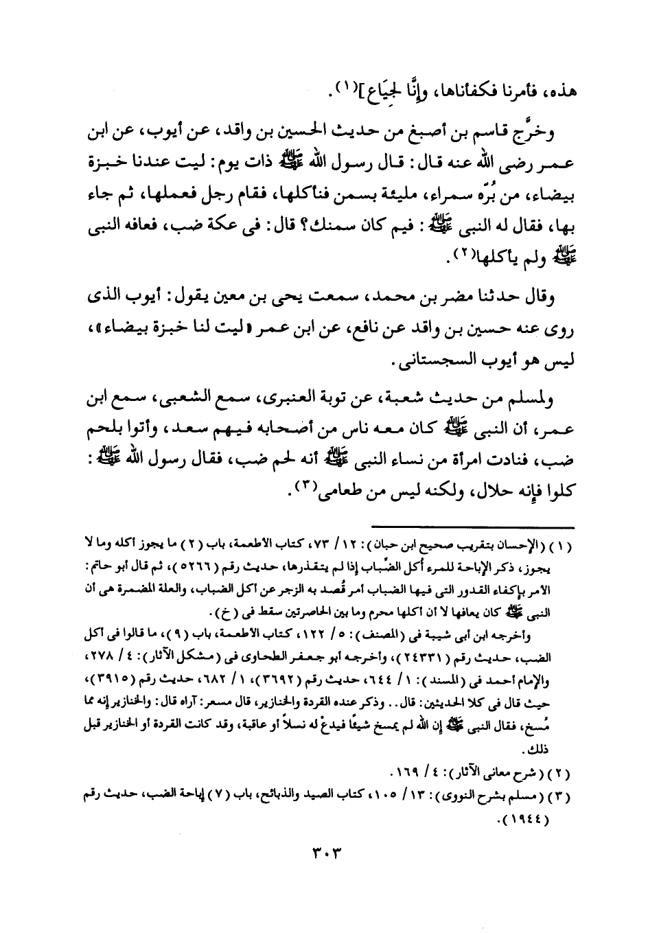 [ (1) ] (الإحسان بتقريب صحيح ابن حبان) : 12/ 73، كتاب الأطعمة، باب (2) ما يجوز أكله وما لا يجوز، ذكر الإباحة للمرء أكل الضّباب، إذا لم يتقذرها، حديث رقم (5266) ، ثم قال أبو حاتم: