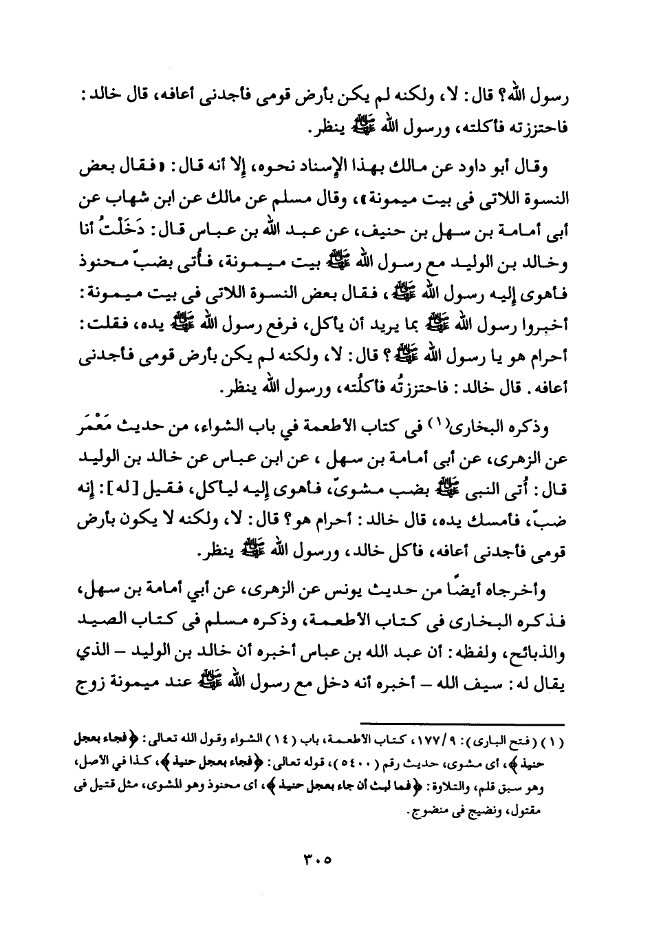 وقال مسلم عن مالك عن ابن شهاب عن أبى أمامة بن سهل بن حنيف، عن عبد اللَّه بن عباس قال: دخلت أنا وخالد بن الوليد مع رسول اللَّه صلى اللَّه عليه وسلم بيت ميمونة» ، فأتى بضبّ محنوذ فأهوى إليه رسول اللَّه صلى اللَّه عليه وسلم، فقال بعض النسوة اللاتي في بيت ميمونة: