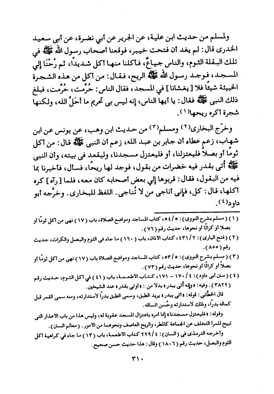 [ (1) ] (مسلم بشرح النووي) : 5/ 54، كتاب المساجد ومواضع الصلاة، باب (17) نهى من أكل ثوما أو بصلا أو كراثا أو نحوها، حديث رقم (76) .