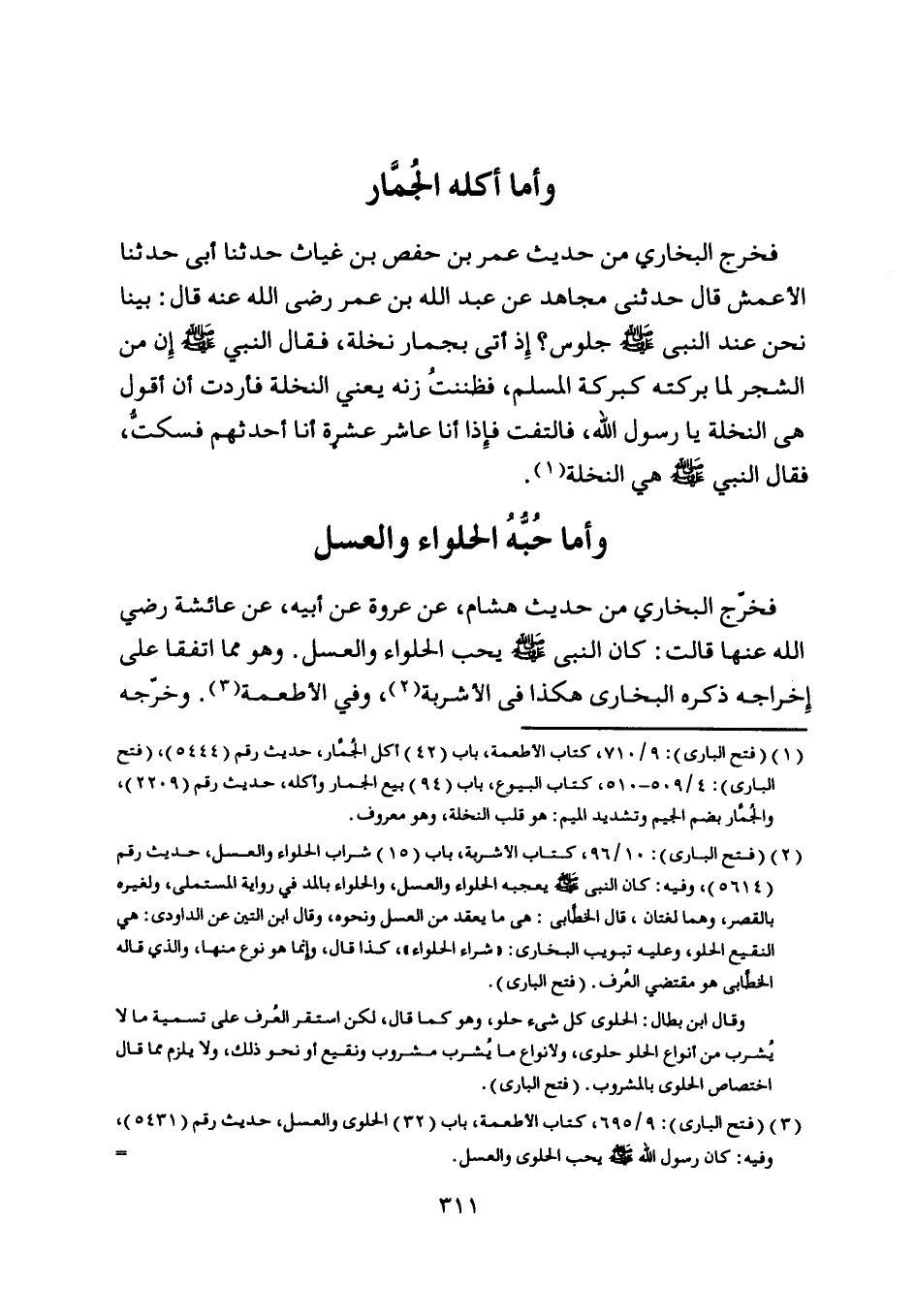 [ (3) ] (فتح الباري) : 9/ 695، كتاب الأطعمة، باب (32) الحلوى والعسل، حديث رقم (5431) ، وفيه: كان رسول اللَّه صلى اللَّه عليه وسلم يحب الحلوى والعسل.
