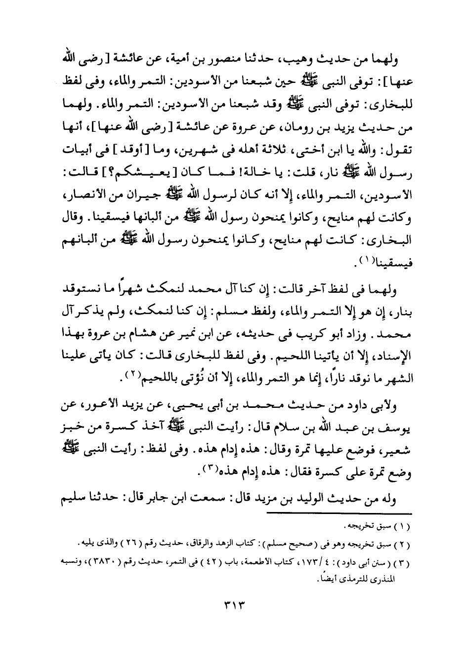 ولهما من حديث وهيب، حدثنا منصور بن أمية، عن عائشة [رضى اللَّه عنها] : توفى النبي صلى اللَّه عليه وسلم حين شبعنا من الأسودين: التمر والماء، وفي لفظ للبخاريّ: توفى النبي صلى اللَّه عليه وسلم وقد شبعنا من الأسودين: التمر والماء. ولهما من حديث يزيد بن رومان، عن عروة عن عائشة [رضى اللَّه عنها] ، أنها تقول: واللَّه يا ابن أختى، ثلاثة أهله في شهرين، وما [أوقد] في أبيات رسول اللَّه صلى اللَّه عليه وسلم نار، قلت: يا خالة! فما كان [يعيشكم؟] قالت: