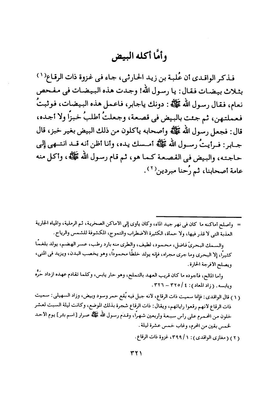 فذكر الواقدي أن علبة بن زيد الحارثي، جاء في غزوة ذات الرقاع [ (1) ] بثلاث بيضات فقال: يا رسول اللَّه! وجدت هذه البيضات في مفحص نعام، فقال رسول اللَّه صلى اللَّه عليه وسلم: دونك يا جابر، فاعمل هذه البيضات،