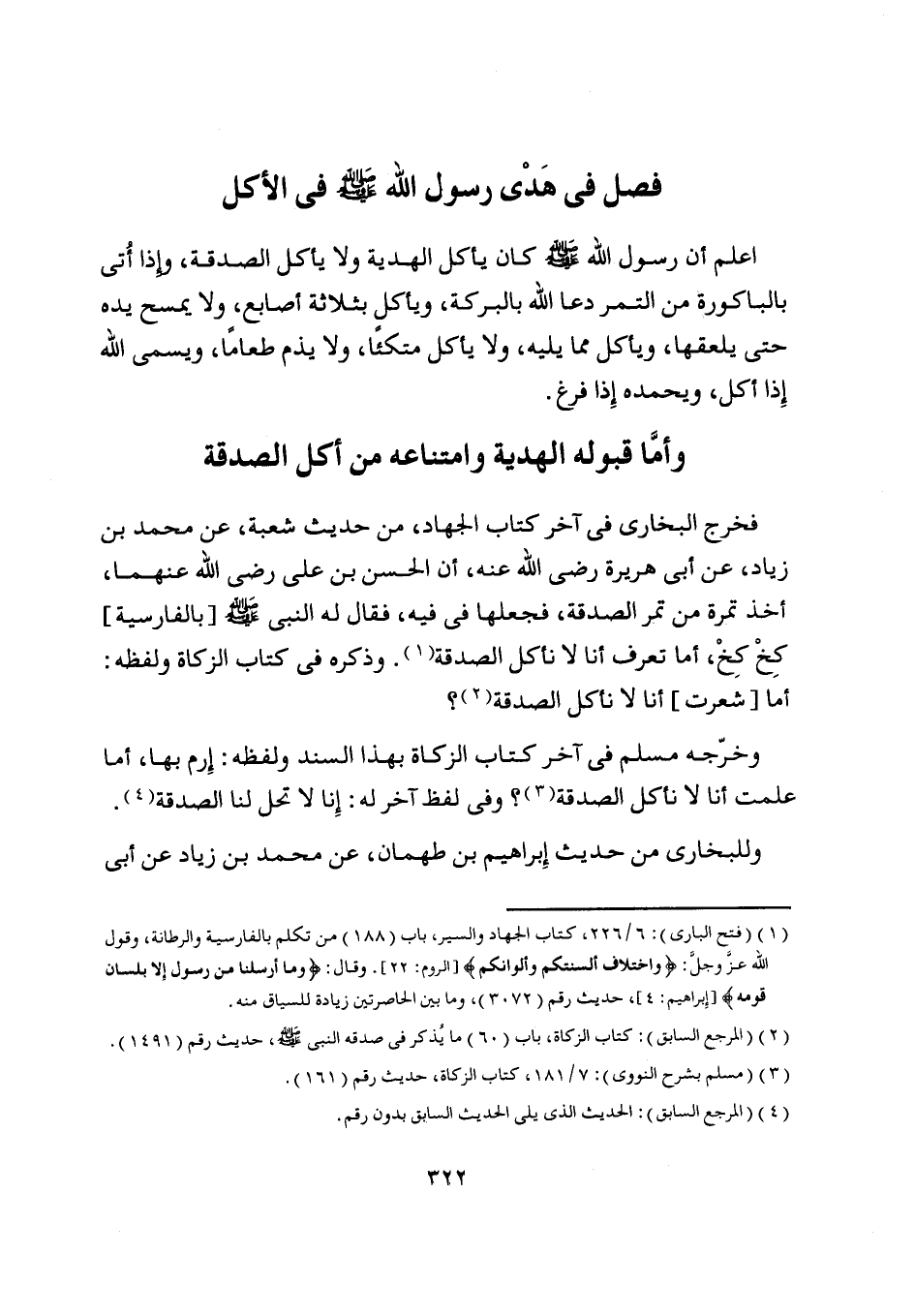 اعلم أن رسول اللَّه صلى اللَّه عليه وسلم كان يأكل الهدية ولا يأكل الصدقة، وإذا أتى بالباكورة من التمر دعا اللَّه بالبركة، ويأكل بثلاثة أصابع، ولا يمسح يده حتى يلعقها، ويأكل مما يليه، ولا يأكل متكئا، ولا يذم طعاما، ويسمى اللَّه إذا أكل، ويحمده إذا فرغ.