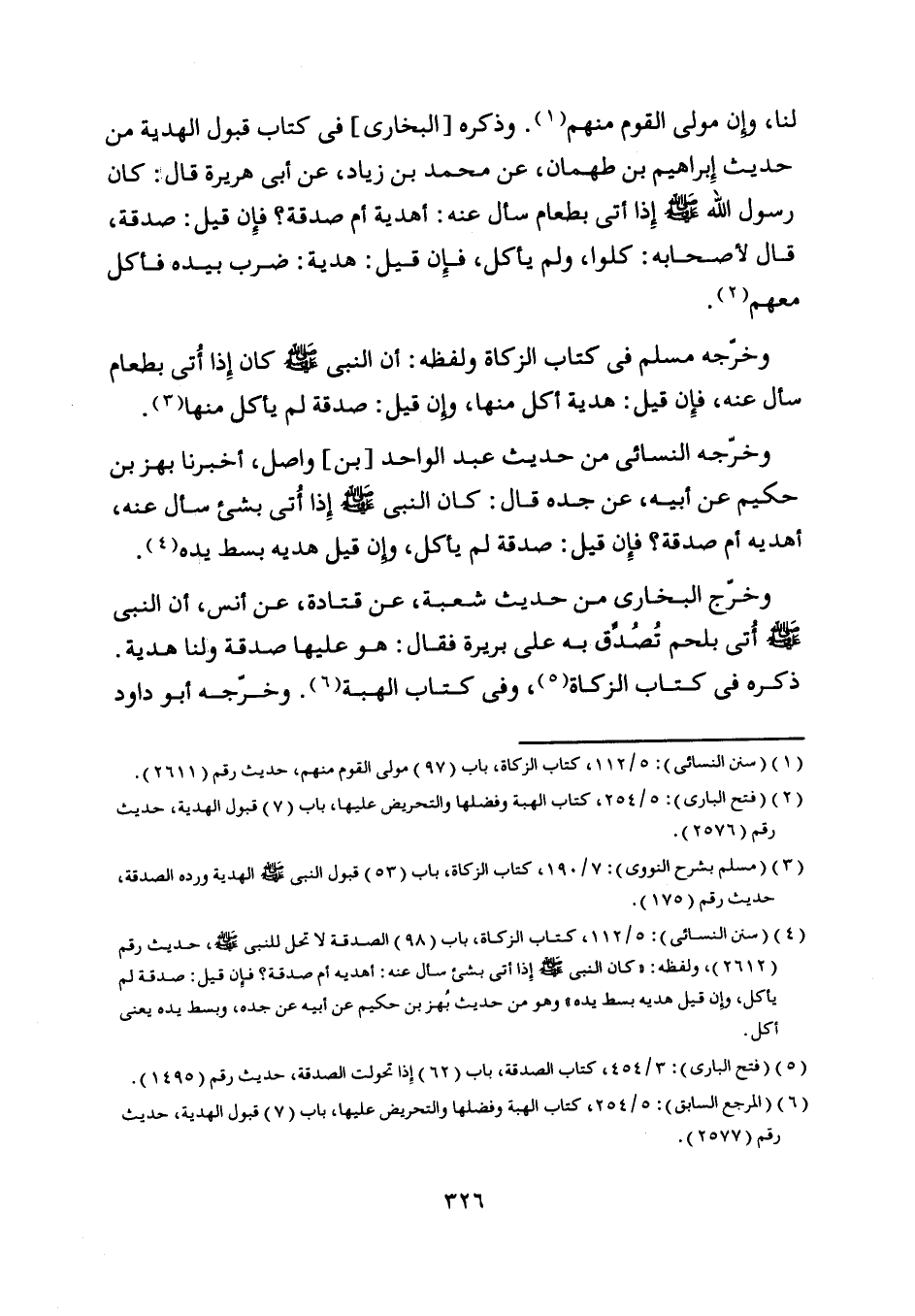 [ (4) ] (سنن النسائي) : 5/ 112، كتاب الزكاة، باب (98) الصدقة لا تحل للنّبيّ صلى اللَّه عليه وسلم، حديث رقم (2612) ، ولفظه: «كان النبي صلى اللَّه عليه وسلم إذا أتى بشيء سأل عنه: أهدية أم صدقة؟ فإن قيل: صدقة لم يأكل، وإن قيل هديه بسط يده» وهو من حديث بهز بن حكيم عن أبيه عن جده، وبسط يده يعنى أكل.