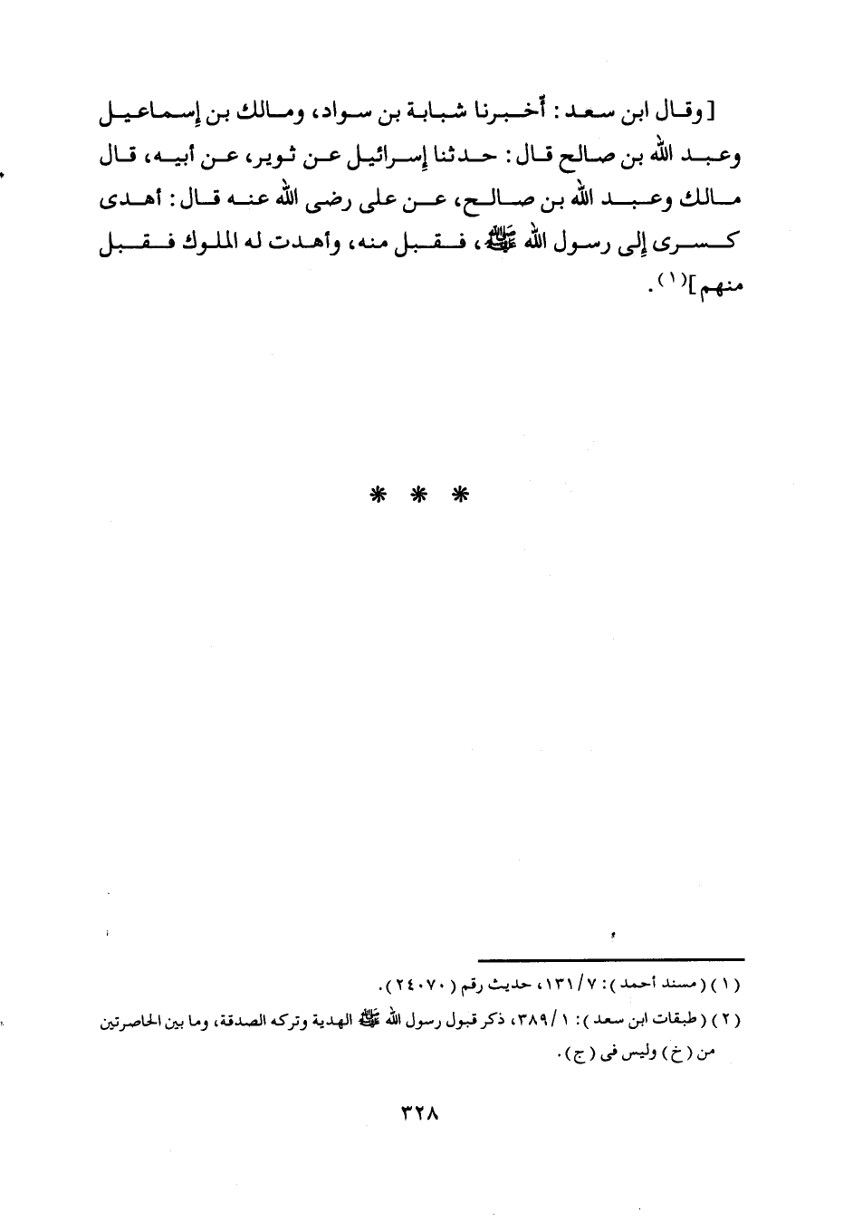 [وقال ابن سعد: أخبرنا شبابة بن سواد، ومالك بن إسماعيل وعبد اللَّه بن صالح قال: حدثنا إسرائيل عن ثوير، عن أبيه، قال مالك وعبد اللَّه بن صالح، عن على رضى اللَّه عنه قال: [ (1) ] أهدى كسرى إلى رسول اللَّه صلى اللَّه عليه وسلم، فقبل منه، وأهدت له الملوك فقبل منهم] [ (2) ] .